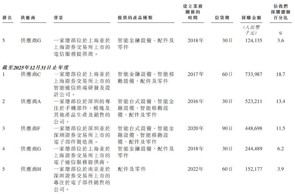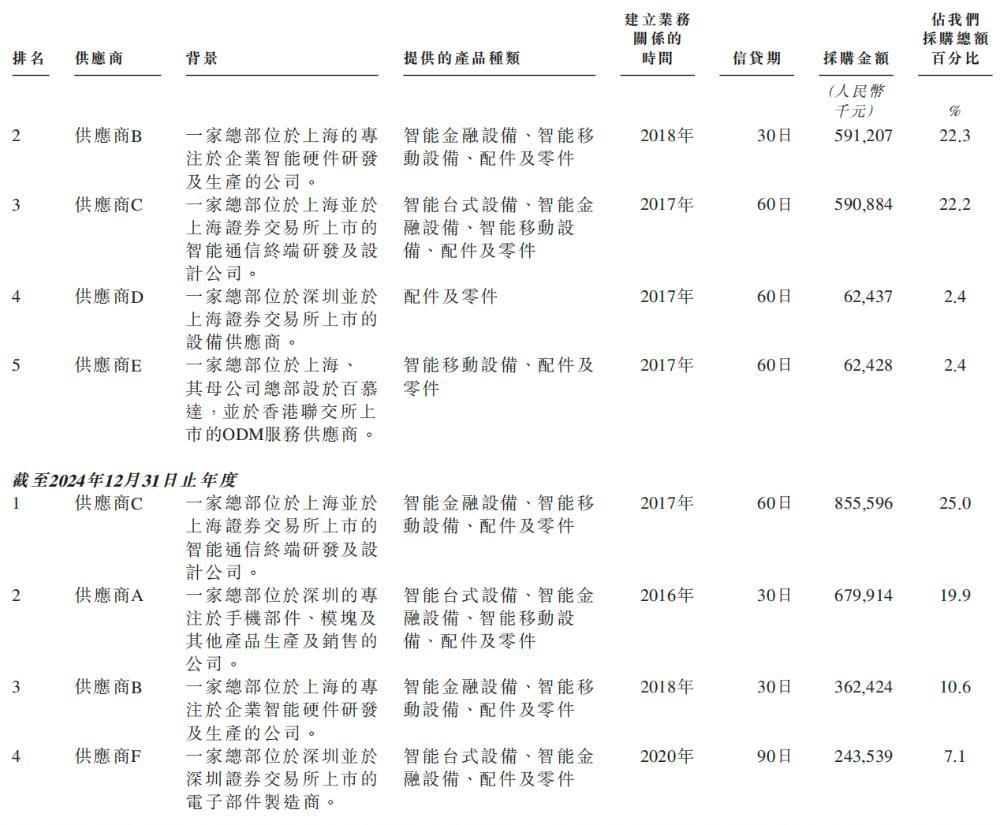 2023年、2024年、2025年,商米科技于往绩记录期间各期间自前五大供应商的采购额合共分别为19.69亿元、22.66亿元及21.03亿元,分别占于采购总额的74.1%、66.3%及53.7%。