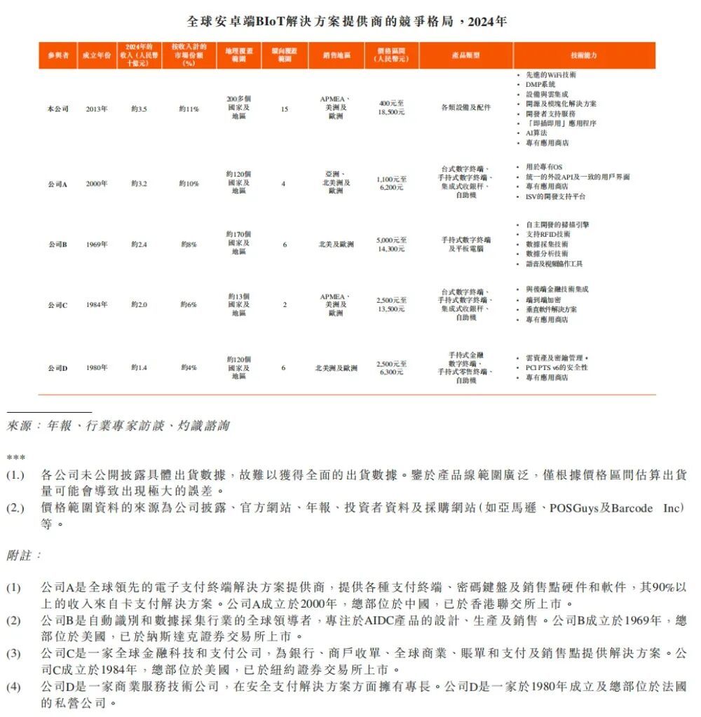 据灼识咨询资料,全球安卓端BIoT解决方案解决方案市场仍处于数字化转型的早期阶段,专注于单一功能的应用场景(例如卡支付)。2024年,全球安卓端BIoT解决方案提供商的竞争格局如下:
