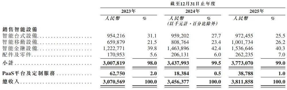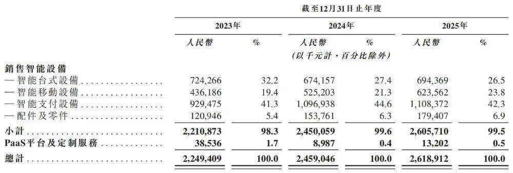 商米科技绝大多数收入来自销售智能设备,2023年-2025年,这部分业务对其年营收的贡献占比分别达到98%、99.5%、99%。
