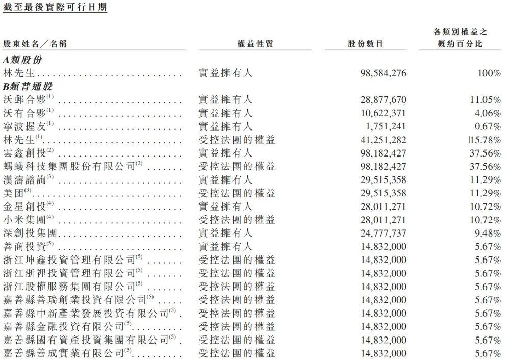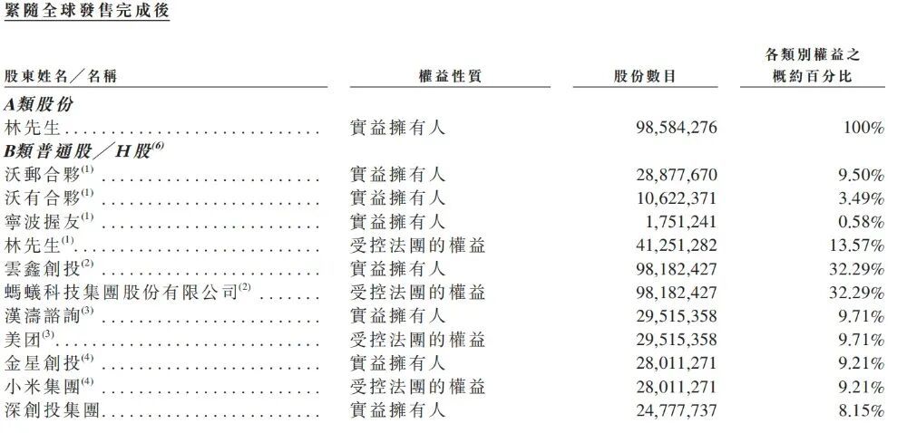 全球发售完成后,林喆将持有商米科技100%的A类股和13.57%的B类普通股。在商米科技的B类普通股中,蚂蚁集团的持股比例将为达32.29%,美团的持股比例将为11.29%、小米的持股比例为9.71%、深创投的持股比例将为8.15%。