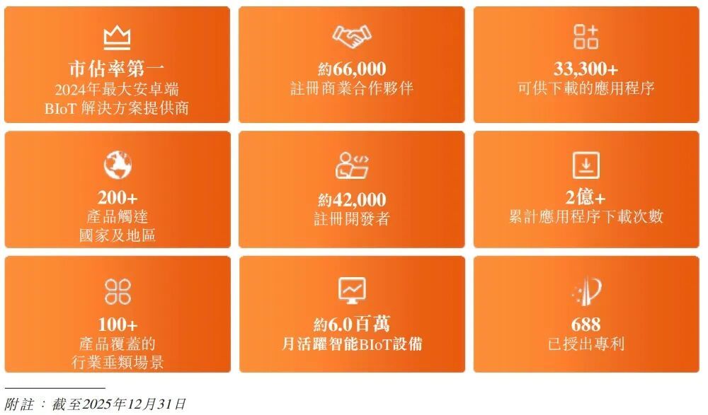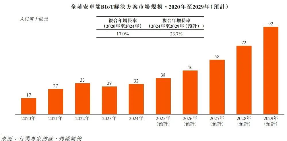 商业物联网(BIoT),即面向商业场景整合应用物联网技术,服务企业经营与商业运作。根据招股书,灼识咨询数据显示,2024年,安卓端BIoT解决方案的全球市场规模约为320亿元。预计到2029年将达约920亿元,2024年至2029年的复合年增长率预计将为23.7%。