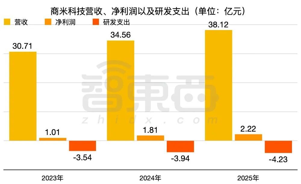 2023年、2024年、2025年,商米科技营收分别为30.71亿元、34.56亿元、38.12亿元,净利润分别为1.01亿元、1.81亿元、2.22亿元,研发支出分别为3.54亿元、3.94亿元、4.23亿元,整体呈逐年增加趋势。