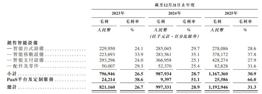 商米科技的商业物联网设备主要由OEM、ODM厂商代工,因此销售成本较高。2023年-2025年,其销售成本分别为22.5亿元、24.6亿元、26.2亿元。