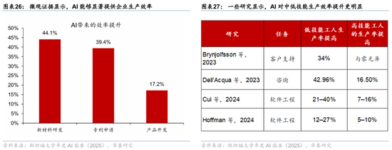 第一,AI的技术价值是否被高估的争议,仍然有待时间去验证,相关公司的高估值存在合理性,且并没有观察到乐观情绪扩散到其他领域。如前所述,AI可能是一种通用技术,如果能够在经济中普遍应用,有提高劳动生产率的潜力。能否实现AGI可能存在较大不确定性,但即使不达到AGI,AI已有进展如果能够跟生产结合已经能够明显提振劳动生产率。例如,大量微观层面的研究显示,AI被使用后能够不同程度提高工作效率,且对低技能工人生产率的提高程度更大(图表26-图表27)。AI相关头部企业虽然估值较贵,但从成长潜力看可能是合理的,且估值远低于互联网泡沫时期。数据显示,头部AI企业从成立到实现1亿美元营收所需的时间显著短于SaaS(软件即服务)公司(图表28),显示AI产业商业化进程较为迅速。从科技板块整体估值来看,当前估值水平虽然偏高,但远低于互联网泡沫破灭时期(图表29),而具体到英伟达和思科,当前英伟达的估值也远远低于思科(图表30)。此外, Albori et al. (2025)通过对美国前十名科技公司应用三阶段定价模型[31]发现,当前市场定价美国科技巨头未来几年较高的增速,但并不是历史罕见,估值是合理的。最后,还没有观察到AI投资热潮显著推高其他经济部门的风险偏好。如果AI投资热潮刺激经济中其他部门风险偏好明显抬升,可能像历史上其他泡沫一样,导致出现大范围资产价格上涨以及过度的杠杆累积,从而加剧系统脆弱性。例如2025年上半年非AI企业投资增速明显偏弱,而对美国个人投资者的调查也显示,投资者当前的乐观情绪仅位于历史中位数水平附近(图表31)。