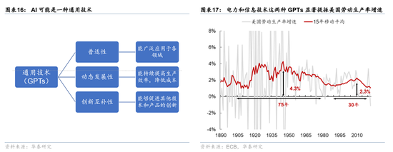 AI可能是一种通用技术(GPT),虽然有潜力显著提振劳动生产率,但可能仍需要较长时间。根据我们此前的研究(参见华泰 | 宏观深度:美国产业革命如何影响长期增长效率和中性利率,2024/6/3),AI可能是一种通用技术[20](General Purpose Technologies,GPTs),类似于电力和信息技术,有明显提振美国劳动生产率的潜力(图表16-图表17)。历史经验显示,新技术从诞生到明显提振劳动生产率存在较长时滞。新技术需要时间才能够在社会中广泛扩散和应用,同时原有的组织形式也需要一定程度变革。例如,电力革命开始于1890年代[21],但劳动生产率加速发生在30年后的1920年代(David, 1990)[22]。类似的,计算机最早于1943年问世[23],但即使在1980年代计算机已经普遍开始使用后,宏观上仍然看不到其对劳动生产率的明显影响。著名经济学家索罗在1987年提出“生产率悖论”:我们到处都看得见计算机,除了生产率统计中[24]。直到1995年,美国劳动生产率数据[25]才开始出现明显上行。参考此前的经验,Helpman and Trajtenberg(1994)提出通用技术对经济增长的影响可以分为播种和收获两个阶段,两者可能间隔数十年,而电力革命和信息技术革命均符合这一特征(图表18)。AI在社会中渗透的速度要超过其他技术,但我们预计显著提振劳动生产率仍需要较长时间才能显现。过去一百多年的历史显示,不同技术从发明到在社会中逐渐普及的速度在加快(图表19),例如汽车(1880年代发明)普及率达到50%花费了40年左右的时间,而互联网(1990年代发明)则只用了20年左右,而ChatGPT等AI应用对居民硬件和固定投入的要求更低;ChatGPT诞生3年已经被六成的民众使用,10%的企业使用。但是其对劳动生产率的显著影响仍可能需要较长时间才能显现。AI虽然经常被视为“超智能/爆发式变革”,但应当被理解为“常规技术”,与以往科技(如电力、互联网、印刷术)一样,决定其影响力的不仅仅是技术能力的提升,更重要的是部署(将技术放入产品或服务中)、扩散(广泛被组织、社会接受并日常化使用)、社会制度适应(法律与制度常态化治理)(Narayanan和Kapoor,2025)。施密特[26]也提到,相信通用人工智能(AGI)或超级智能的引爆点,与技术发展史背道而驰,因为技术进步和普及都是循序渐进的;技术往往需要数十年才能广泛应用。
