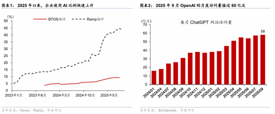 2025年以来,AI在美国渗透加速,企业加码AI相关投资,对美国经济增长产生重要支撑。2025年以来,AI在美国渗透加速:美国企业使用AI的比率快速上升至10%附近,而Ramp AI index所指示的企业AI付费的比率也在2025年快速回升(图表1),特别是信息技术、金融等行业;而根据2025年4月Menlo Ventures与Morning Consult的调查[1],61%的美国成年人在过去六个月中使用过人工智能,近五分之一的人每天都使用; OpenAI的月度访问量持续增长,9月接近60亿次(图表2)。此外,互联网巨头资本开支大幅上升。脸书、微软、谷歌、亚马逊等美国超大规模运营商(Hyperscaler)2025年资本开支进一步上升,指引显示年度总规模超过3000亿美元。AI相关投资对2025年上半年美国经济增长的贡献达到1个百分点左右,缓冲了关税、驱逐移民等冲击的影响(参见【华泰宏观|深度】美国的“双速经济”格局及其资产价格含义,2025/10/22)。2025年上半年美国AI相关投资季比折年增速连续两个季度达到30%以上,而其他投资则因为不确定性等因素而整体偏弱(图表3)。企业AI相关资本开支还拉动数据中心以及电力投资的大幅增长(图表4)。