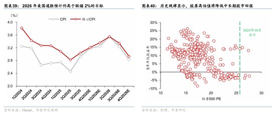 AI投资短期或加大通胀压力,但中长期看可能有助于压低通胀。一方面,AI投资提振总需求,短期或加大美国经济的通胀压力。2025年美国经济遭遇关税、驱逐移民以及DOGE等多重冲击,经济动能整体放缓,但AI投资提供了明显缓冲(参见【华泰宏观|深度】美国的“双速经济”格局及其资产价格含义,2025/10/22)。2026年随着关税等冲击的消退,财政政策和货币政策偏向支持性,预计美国经济动能将有所修复,AI投资将进一步提振总需求,短期或加大通胀压力。另一方面,中长期看,AI或有助于压低通胀。AI有提高美国劳动生产率的潜力,有助于增加供给能力,从而压低通胀。此外,AI可能对就业市场带来结构性压力,降低劳动者议价能力,从而压低工资和通胀。考虑到AI对劳动生产率以及对企业市场的影响仍需要时间才会显现的更加明显,我们预计AI投资在2026年更多体现为加大美国通胀的压力,我们预计2026年美国通胀虽然相对2025年下半年有所降温,但是仍然高于联储2%的目标(图表40)。
