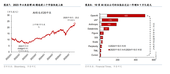 争议一:AI的技术价值是否被高估?2025年以来,AI相关企业市值大幅增长,截至10月31日,累计增加4.9万亿美元,而未上市公司市值在过去12个月也增加1万亿美元(图表7-图表8)。但直接来自AI的收入远不及市值的增加。例如OpenAI当前的年化收入仅为130亿美元(估值为5000亿美元)。AI相关企业高估值的背后支撑因素是AI的潜力以及未来的商业化前景,但乐观派和悲观派在AI技术价值上存在分歧。
